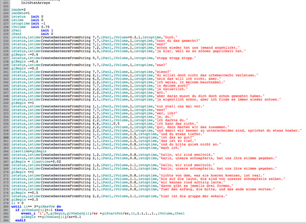 Keines der in "smalltalk" vorkommenden Worte ist so gesprochen worden, auch nicht die Worte der Satzfragmente, die aus deutschen Wörtern bestehen. Dieses gilt auch für die obige Audio-Einführung. Jedes Wort ist aus einzelnen Lauten synthetisiert worden. Nur diese Laute sind real und stammen von der Künstlerin. Alles, was in "smalltalk" zu hören ist, stammt in irgend einer Weise aus dem Mund der Künstlerin. Wenn es sich nicht um die realen Laute handelt, die zu Wörtern zusammengesetzt werden, dann wurden die Geräusche in ihre Frequenzbestandteile zerlegt, um Gesetzmäßigkeiten zu erhalten, die dann verändert werden können. Für die Extraktion der einzelnen Laute aus gesprochenen Texten und für die Frequenzzerlegung, also für alle Phonetikanalysen steht das Programm Praat als Werkzeug zur Verfügung. Auch die realen Laute, die für die Worte eines Satzes benutzt werden, werden modifiziert in Bezug auf Länge, Tonhöhe und Lautstärke, in dem Maße, wie es die Intonation des jeweiligen Satzes im Kontext erfordert. Für eine sinnvolle Intonation ist es erforderlich, die Laute zu standardisieren. Dieses betrifft besonders die Tonhöhe der Vokale und der Konsonanten l,m,n, also all die Laute, deren Tonhöhe durch die Stimmbänder und/ oder den Parametern des aus Mund und Nase bestehenden Resonanzvolumens (z.B. durch die Zungenstellung) beeinflusst werden können. Die Aufbereitung der Laute und Verfremdung der Geräusche sowie die Erstellung des Audio-Inhalts von smalltalk und der obigen Einführung wurde in Csound durchgeführt.